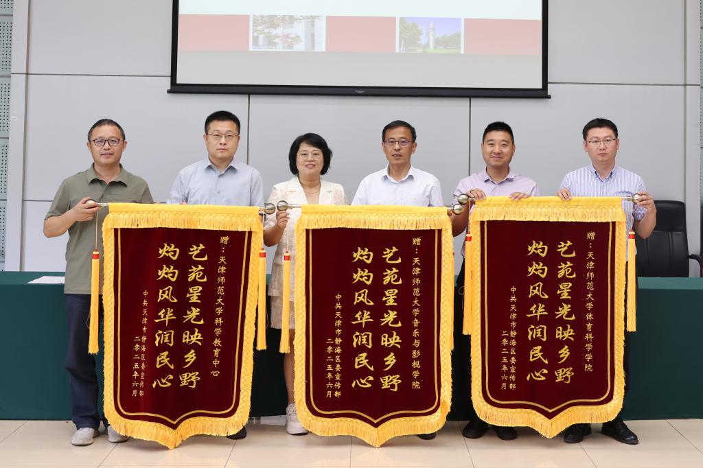 座谈会后,静海区委宣传部为我校音乐与影视学院、科学教育中心、体育科学学院赠送锦旗,对我校凝聚群众力量,助力乡村振兴给与肯定和赞赏。
