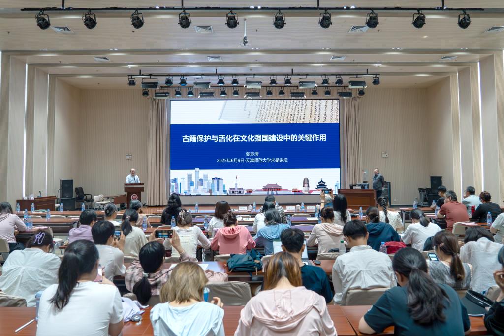 本站讯(通讯员 程娜)6月9日下午,学校举行“特聘讲座教授”聘书颁发仪式暨第104场“求是讲坛”学术报告会,国家图书馆原常务副馆长张志清教授受聘,并以《古籍保护与活化在文化强国建设中的关键作用》为题作学术报告。校党委副书记、校长巩金龙,校党委常委、副校长秦龙出席。天津多所高校图书馆、公共图书馆、天津市档案馆领导同仁,我校相关职能处室、学院、古籍保护相关专业师生代表200余人参加本次活动。