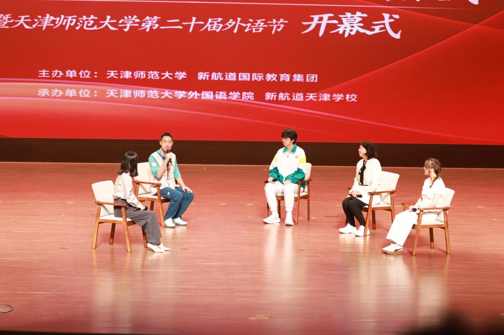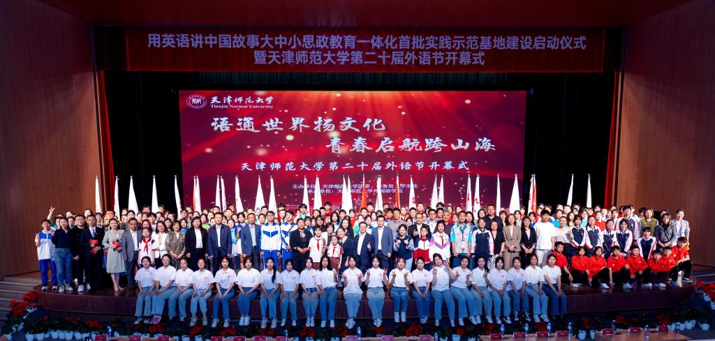 作品展演环节,外国语学院师生及示范基地中小学的青少年们以多语种朗诵、情景演绎等艺术形式,在跨越时空的对话中展现中华文明的深厚底蕴和思政教育的创新表达。外国语学院教师带来的六国语朗诵《百年天津》,生动展现近代天津的百年风华,完美诠释了“一带一路”的文化交融;师大校友的拂袖之间,面具与袍万变,将川剧变脸的精髓展现得淋漓尽致;霍元甲学校少年武者拳风如雷,刚健雄姿展现武术之魂;天津市第二十一中学《天津的桥》用诗行勾勒桥的钢铁脊梁和岁月留痕,让建筑成为城市记忆的见证者;昆明路小学的英文朗诵以童声传递传统文化的斑斓色彩,展现非遗技艺的当代活力;第七中学《汉字趣话》通过文字解构和溯源,带领观众触摸汉字演变的千年脉络;外国语学院曾杨函、范雨沛通过展现基础教育的优势和传播天津传统美食等,再现了“用英语讲中国故事”的魅力;天津中学《讲好中国故事 传递时代强音》以铿锵誓言诠释青年文化自信;第一百中学英文版《岳阳楼记》创新演绎范仲淹“先忧后乐”的家国情怀;实验中学《诗韵千年》通过情景小品,让李白、王维等诗人“穿越”现代,在幽默对白中解码诗词之美。