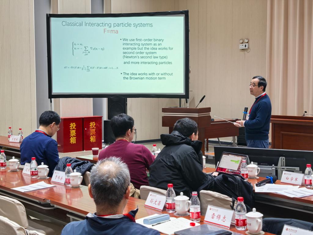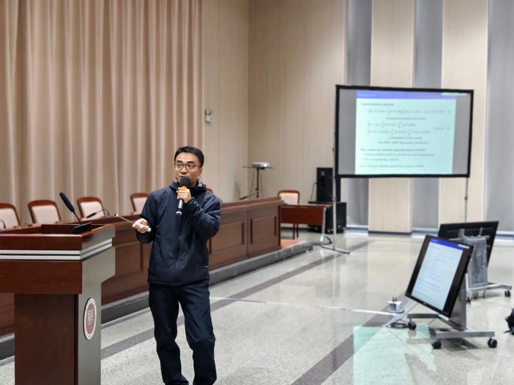 上海交通大学金石教授以《Random Batch Methods for interacting particle systems and molecular dynamics》为题作报告。他展示了为具有大量粒子的经典相互作用粒子系统开发的随机批处理方法。对于其中一种方法,给出了在某些特殊相互作用下与粒子数无关的误差估计。在埃瓦尔德求和的框架下,该方法也扩展到具有库仑相互作用的分子动力学。