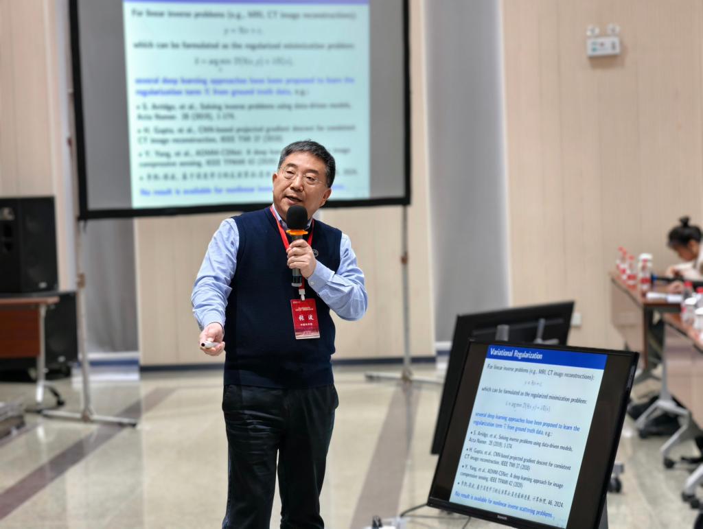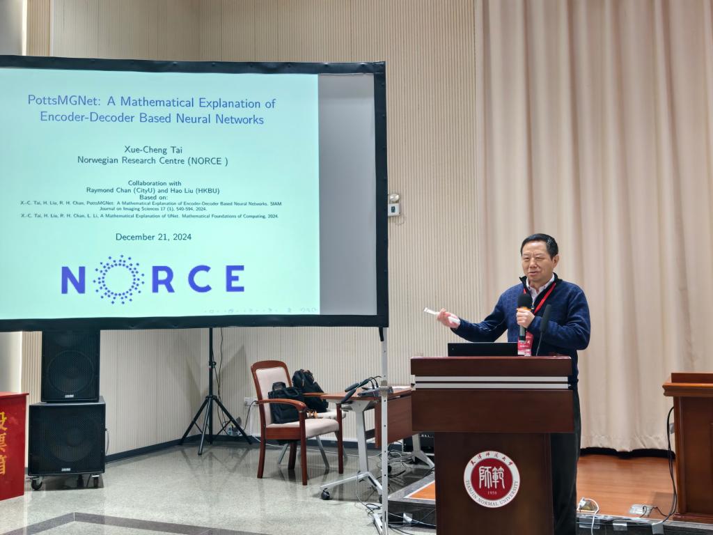 挪威研究中心台雪成教授以《PottsMGNet: A Mathematical Explanation of Encoder-Decoder Based Neural Networks》为题作报告。他介绍了PottsMGNet,这是一种基于多重网格方法的算子分裂方案,用于求解Potts模型,架构与编码器—解码器网络相同,并展示了一种新的演化方程混合分裂方法,证明了UNet正是一种解决某些控制问题的混合分裂方案。