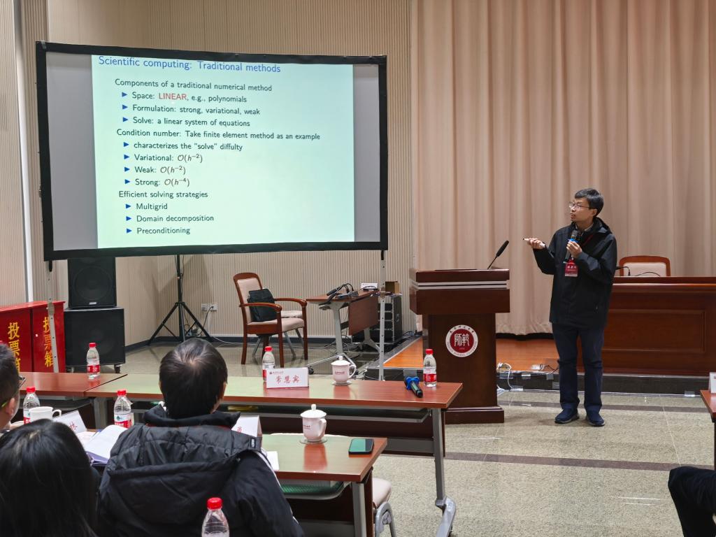 中国科学技术大学陈景润教授以《Machine learning-based methods for PDEs: The issue of condition number》为题作报告。他从传统数值方法中的条件数的角度讨论了几种基于机器学习的求解偏微分方程的方法:深度混合残差法、表征参数空间中解质量的粗糙度指数、多重网格方法中基于算子学习的粗网格平滑器以及随机特征方法的鲁棒预处理策略。