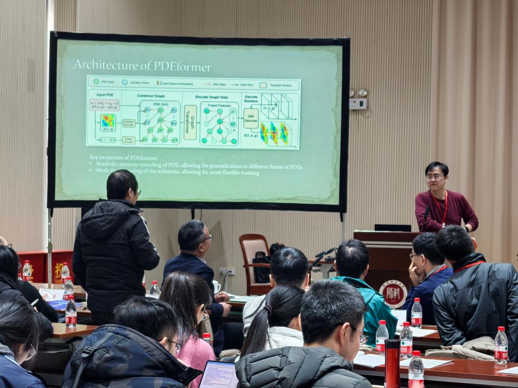 北京大学董彬教授以《PDEformer: Towards a Foundation Model for Solving Parametric PDEs and Beyond》为题作报告。他展示了在设计和训练一个名为PDEformer的基础模型方面的工作,该模型旨在作为一个灵活高效的求解器,解决一系列参数PDE问题。其设计旨在适应需要重复求解PDE的应用,在这些应用中寻求效率和准确性之间的平衡。