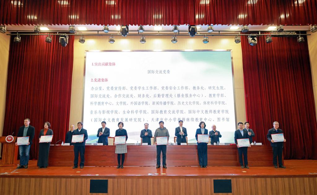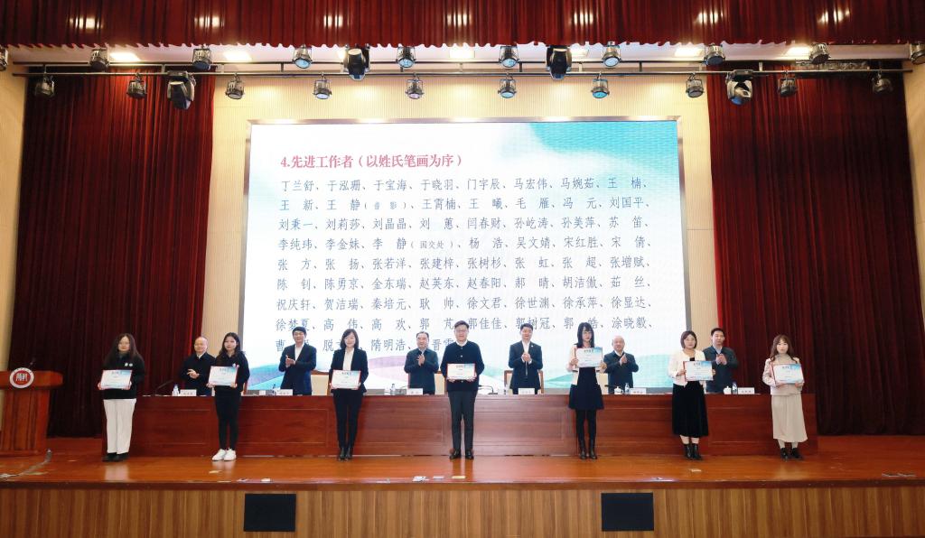 校领导为获奖集体和个人颁奖。与会人员共同观看“汉语桥”回顾片。国际教育交流学院、国际交流处、国际中文教师教育学院(国际中文教育发展研究院)、后勤管理处、党委安全工作部相关负责同志以及志愿者代表作交流发言。我校机关各部、处(室)、直属单位、各学部(院)师生代表,受表彰人员参加会议。