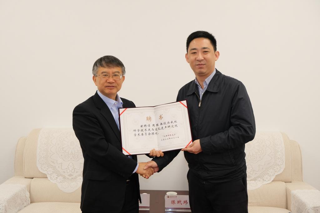 报告前,副校长陈玳玮与周程教授进行了会谈。他对周程教授来校表示诚挚欢迎,并向周程教授颁发了科学技术史与文化遗产研究院学术委员会顾问聘书,他介绍了学校的发展历程,以及近年来在教学科研、人才培养等方面取得的成就,并就科学技术史学科发展进行交流,共同探讨如何进一步推动科学技术史学科的进步与发展。