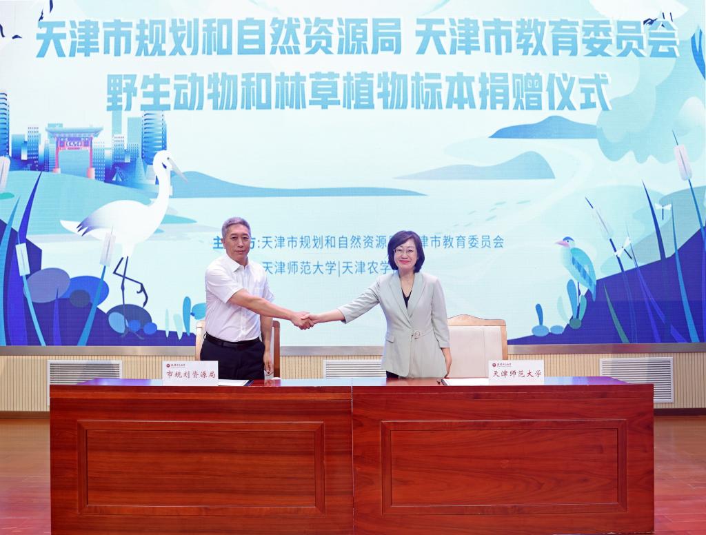会上,天津市规划和自然资源局分别向我校移交野生动物标本60件、向天津农学院移交林草植物标本2345件,并现场签订捐赠协议。此次捐赠学校的60件野生动物标本,包括国家一级保护动物标本7件、国家二级保护动物标本28件、“三有”保护动物标本21件、其他动物标本4件,种类丰富、栩栩如生,均为近年来社会救助接收和执法部门罚没移交的野生动物死体制作而成,这些标本已陈列在我校生态记忆馆展厅。