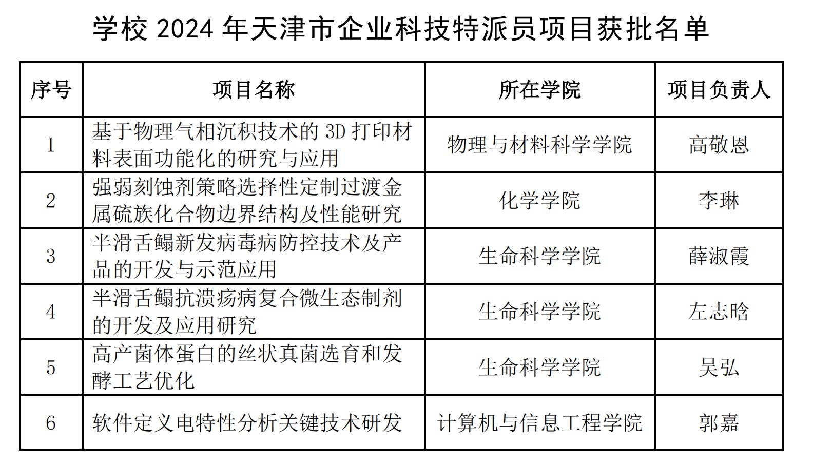 科学技术处消息(通讯员 朱虹)近日,天津市科学技术局公布了2024年天津市企业科技特派员项目评审结果。本次评审我校共申报7项,成功获批立项6项,项目获批数量创我校历年新高。