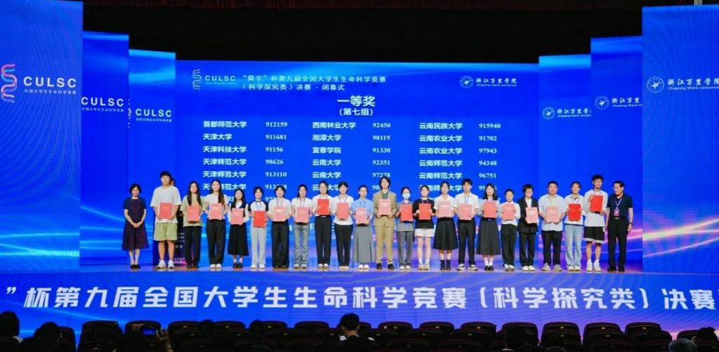生命科学学院消息(通讯员 付博菲)7月21-23日,由全国大学生生命科学竞赛委员会主办的第九届全国大学生生命科学竞赛(科学探究类)决赛在浙江万里学院落幕。我校生命科学学院三支入围队伍,凭借扎实的专业知识、过硬的科研能力和精彩的现场答辩,均荣获国家级一等奖,刷新我校在该项赛事中的历史最佳成绩。