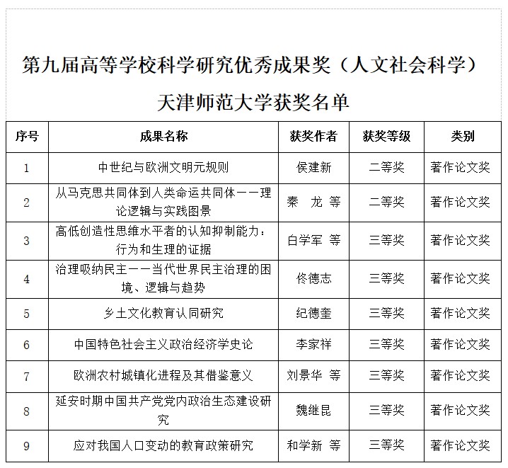 社会科学处消息(通讯员 宋昊泽)近日,第九届高等学校科学研究优秀成果奖(人文社会科学)评选结果正式公布,我校共有9项成果获奖,获奖数量再创历史新高,比第八届增长28.6%,位列天津市第二、市属高校第一。
