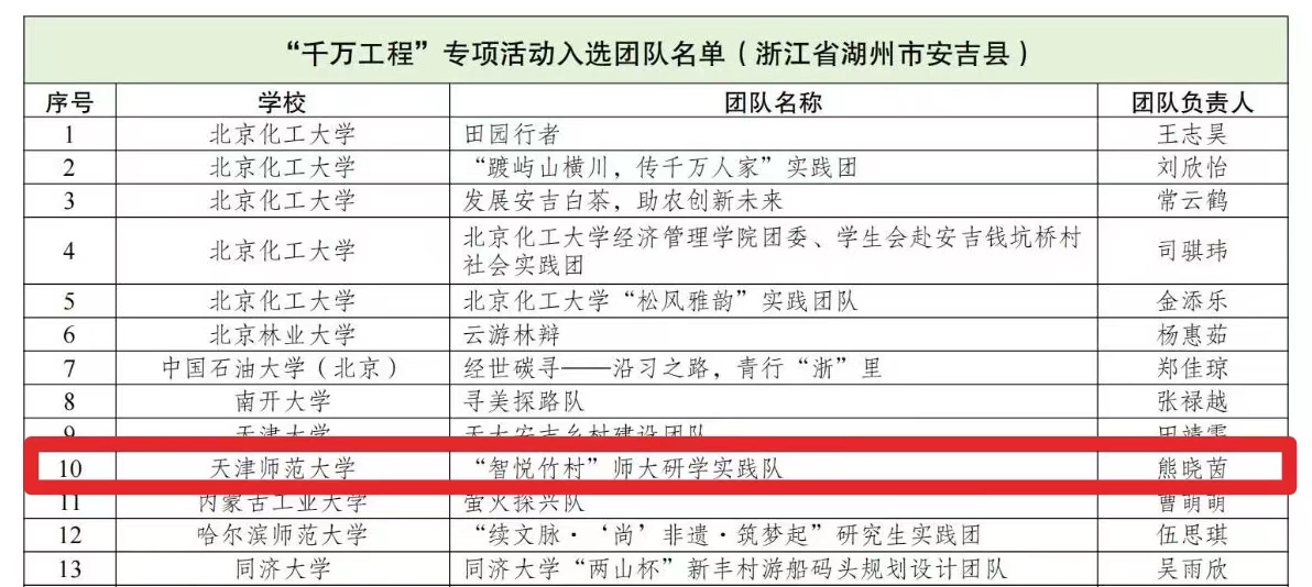 由中国青年创业就业基金会、团浙江省委共同主办的2024年全国大学生暑期文化科技卫生“三下乡”社会实践“千万工程”专项活动共收到全国154所高校464支团队报名。经主办方对申报材料进行基础审核,并结合承办区(市、县)实际需求,最终确定329支入选团队。其中,我校1支队伍入选。