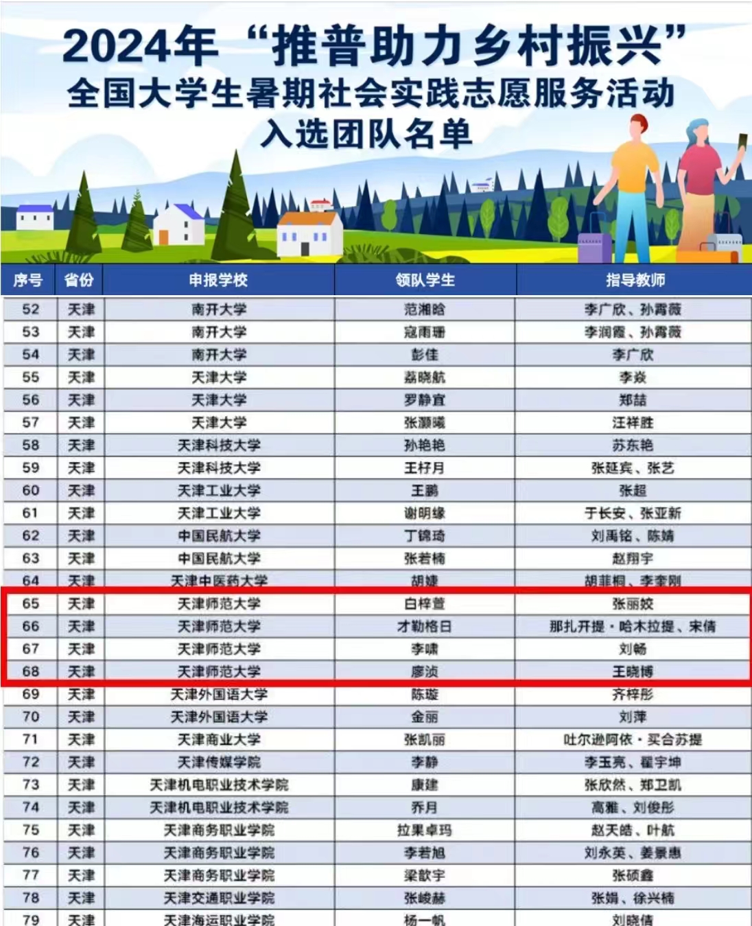 教育部语言文字应用管理司、共青团中央青年发展部组织开展的2024年“推普助力乡村振兴”全国大学生暑期社会实践志愿服务活动,共有1452所高校的6998支团队参与申报,经专家审议,天津市共有28支团队入选,其中我校有4支团队成功入选。