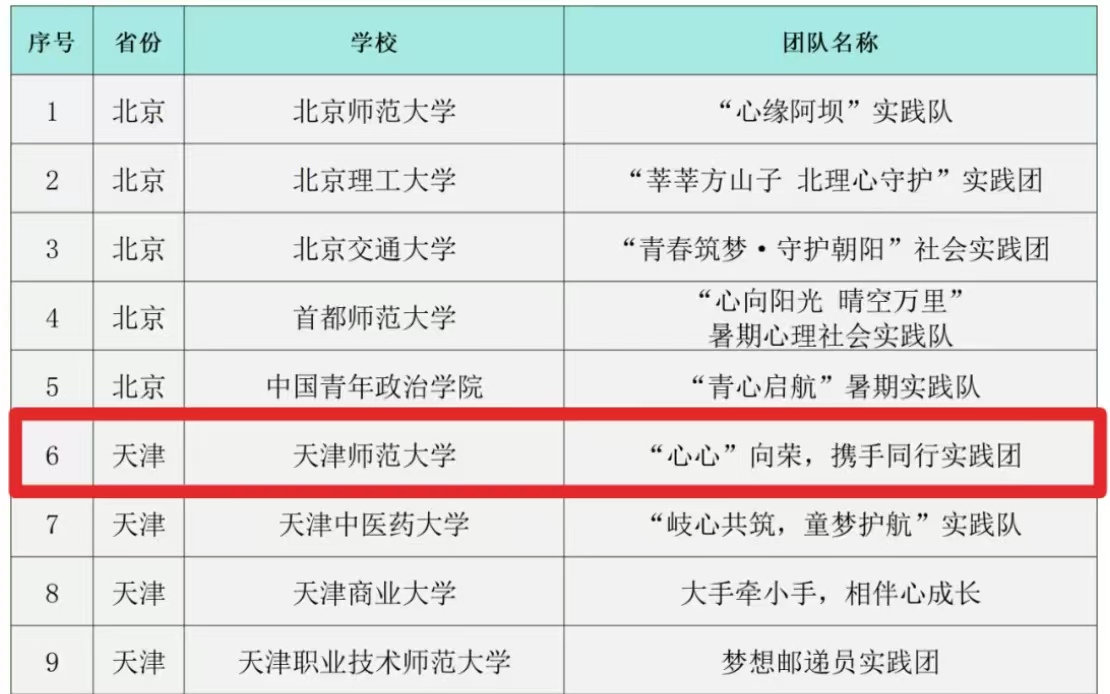 为加强青少年心理健康守护工作,共青团中央维护青少年权益部、中国青年报社开展“三下乡”社会实践之“心理健康青春行”专项活动。全国共有1389支团队报名,最终确定104支入选团队,其中我校有1支队伍入选。