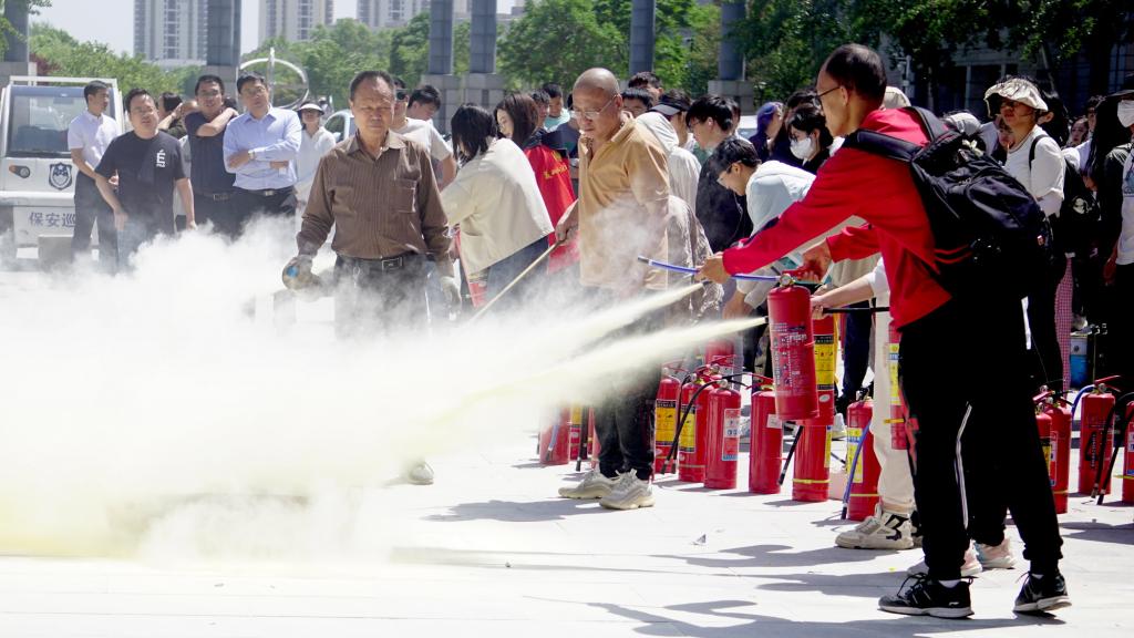 演练结束后,保卫处消防科科长张辰昊讲解了预防火灾、处置初起火灾的方法,介绍了灭火器和消防水龙带的使用方法。在专业人员的指导下,现场同学积极体验正确灭火过程,活动现场气氛热烈,互动踊跃。
