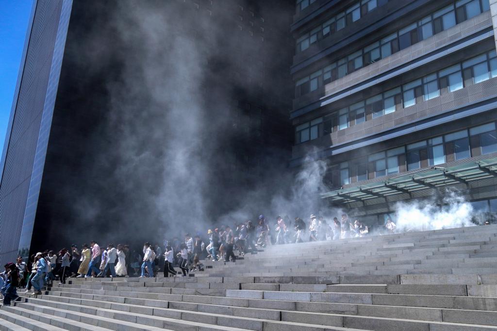下午1:00,疏散演练正式开始。演练模拟图书馆发生火情,浓烟迅速向楼道蔓延,值班人员发现后立即拉响警报,同时组织学生按既定路线疏散到相应集合点。同学们用湿毛巾掩住口鼻,俯身逃生。整个疏散过程紧凑有序,经过各学部(院)负责老师详细清点人数,确认疏散过程中无一学生遗留在图书馆,全部安全快速到达。演练顺利完成,达到了检验预案、锻炼安全委员队伍、科普宣传的目的。