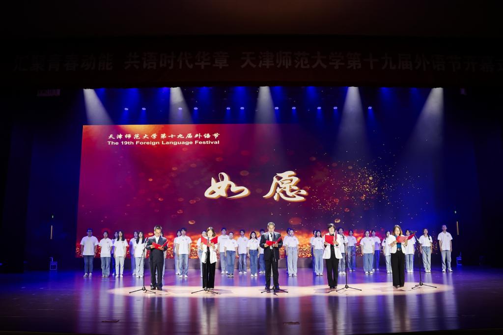 本届外语节开幕式现场节目涵盖中国传统文化、民族团结、“一带一路”沿线国家民族风情等主题;用朗诵、舞蹈、话剧、多语种演唱等形式,为全校学生搭建起跨文化交流互鉴的平台。朗诵、合唱《如愿》,回望百年风云,感怀先辈的奋斗与牺牲,感悟山河无恙,国泰民安;民族歌舞《民族一家亲》紧紧围绕铸牢中华民族共同体意识主线,展现不同民族独特的魅力;舞台剧《光亮》将传统文化与现代文化相结合,饱含深意、耐人寻味;舞蹈《青春之歌》展现革命先辈点燃救亡图存的希望火种,奏响愤慨激昂的青春之歌;合唱《一起向未来》用五国语言的歌声交织,承载着希冀与憧憬,将开幕式气氛推向高潮。