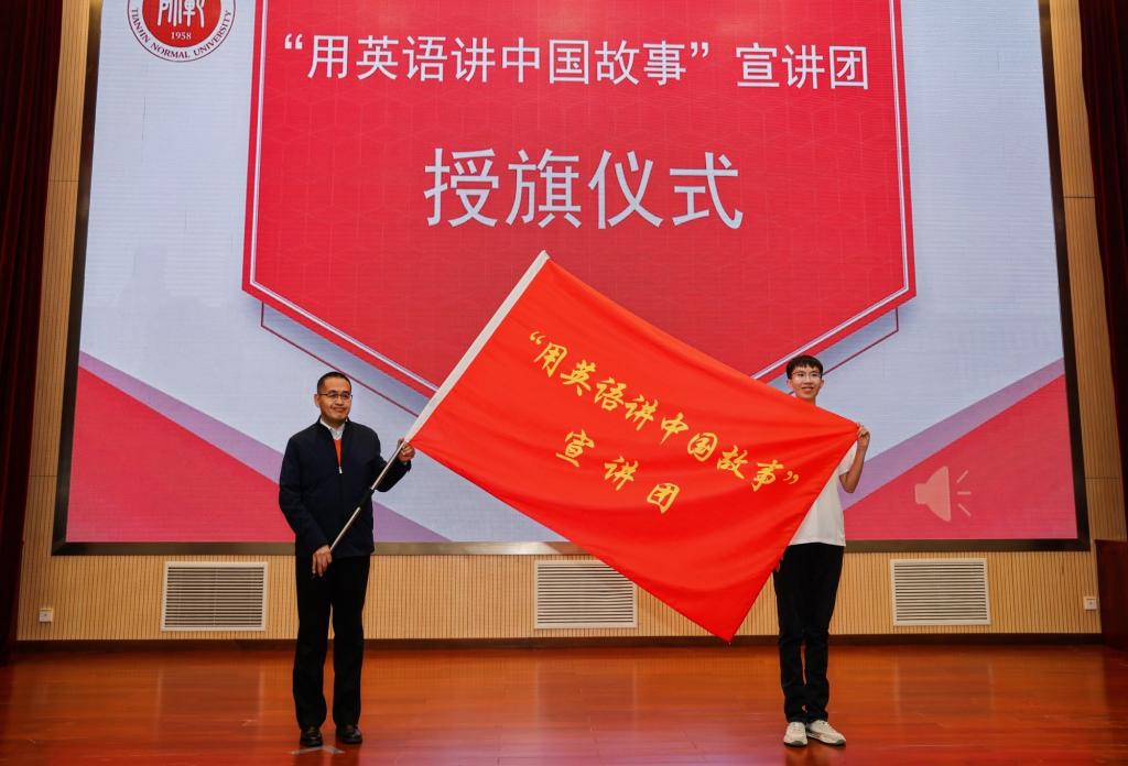 外国语学院院长冀小婷宣读《关于成立“用英语讲中国故事”宣讲团的决定》。外国语学院党委书记田鹏为“用英语讲中国故事”宣讲团团长授旗。