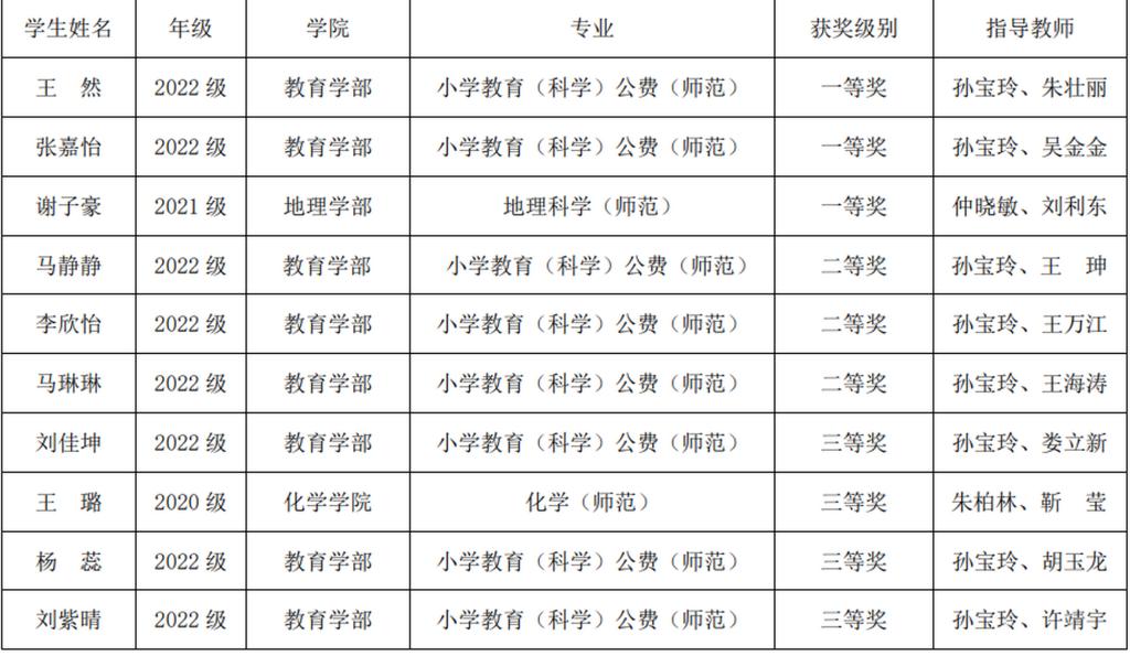 教育学部消息(通讯员 米溢 孙宝玲 许靖宇)日前,由中国青少年科技教育工作者协会主办,西华师范大学和中国青少年科技教育工作者协会科学教师教育专委会承办的第十一届全国科学教育专业师范生教学技能创新大赛(本科生和研究生赛道)决赛奖项公布,我校学生获一等奖3项、二等奖3项、三等奖4项,所有指导教师获优秀指导教师,学校获优秀组织奖。