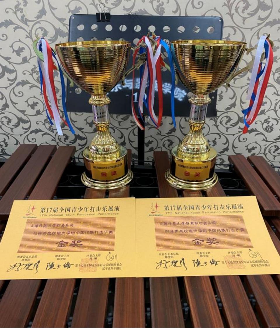 在第十七届全国青少年打击乐展演中,由器乐系主任王静老师带队,邹菲、刘梓豪、杨佳越、李光耀、朱腾昊、张书杰、李政泽、侯宇曦、姚嘉怡等9名学生共同演奏的曲目《龙舞》和张书杰、李政泽演奏的曲目《新楚汉决战》获得“综合类高校组大学组中国民族打击乐类”金奖,王静荣获“优秀指导教师”奖。
