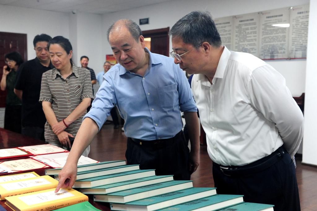在图书馆,杨春武一行参观了古籍保护研究院、特藏室,与古籍保护研究院常务副院长、天津市优秀教师姚伯岳进行深入交流,对其执着的敬业精神和渊博学识深表敬意。杨春武代表市总工会向我校赠送了天津市劳模口述史和天津市职工作家创作文丛系列丛书。图书馆党政负责人陪同参观并参加赠书仪式。
