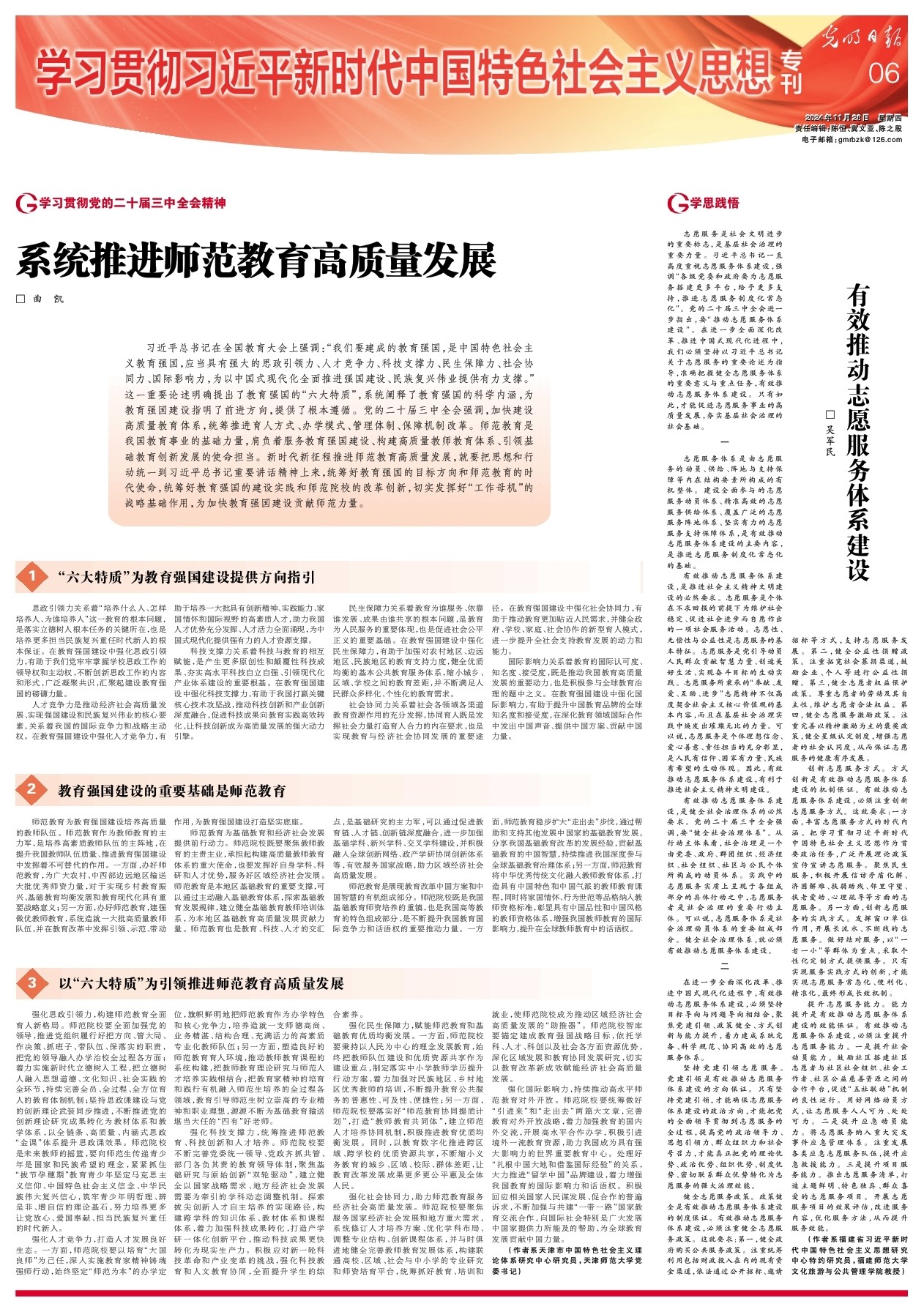 习近平总书记在全国教育大会上强调:“我们要建成的教育强国,是中国特色社会主义教育强国,应当具有强大的思政引领力、人才竞争力、科技支撑力、民生保障力、社会协同力、国际影响力,为以中国式现代化全面推进强国建设、民族复兴伟业提供有力支撑。”这一重要论述明确提出了教育强国的“六大特质”,系统阐释了教育强国的科学内涵,为教育强国建设指明了前进方向,提供了根本遵循。党的二十届三中全会强调,加快建设高质量教育体系,统筹推进育人方式、办学模式、管理体制、保障机制改革。师范教育是我国教育事业的基础力量,肩负着服务教育强国建设、构建高质量教师教育体系、引领基础教育创新发展的使命担当。新时代新征程推进师范教育高质量发展,就要把思想和行动统一到习近平总书记重要讲话精神上来,统筹好教育强国的目标方向和师范教育的时代使命,统筹好教育强国的建设实践和师范院校的改革创新,切实发挥好“工作母机”的战略基础作用,为加快教育强国建设贡献师范力量。
