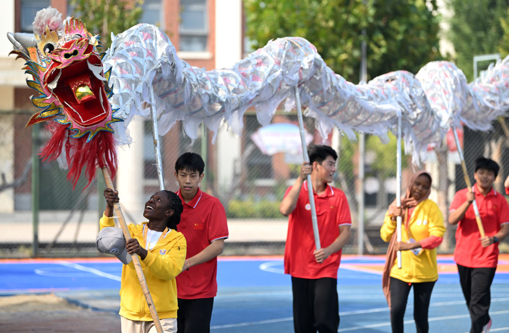 10月25日,“汉语桥”选手在天津霍元甲学校的操场上学习舞龙