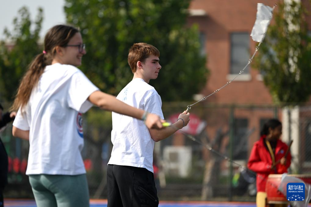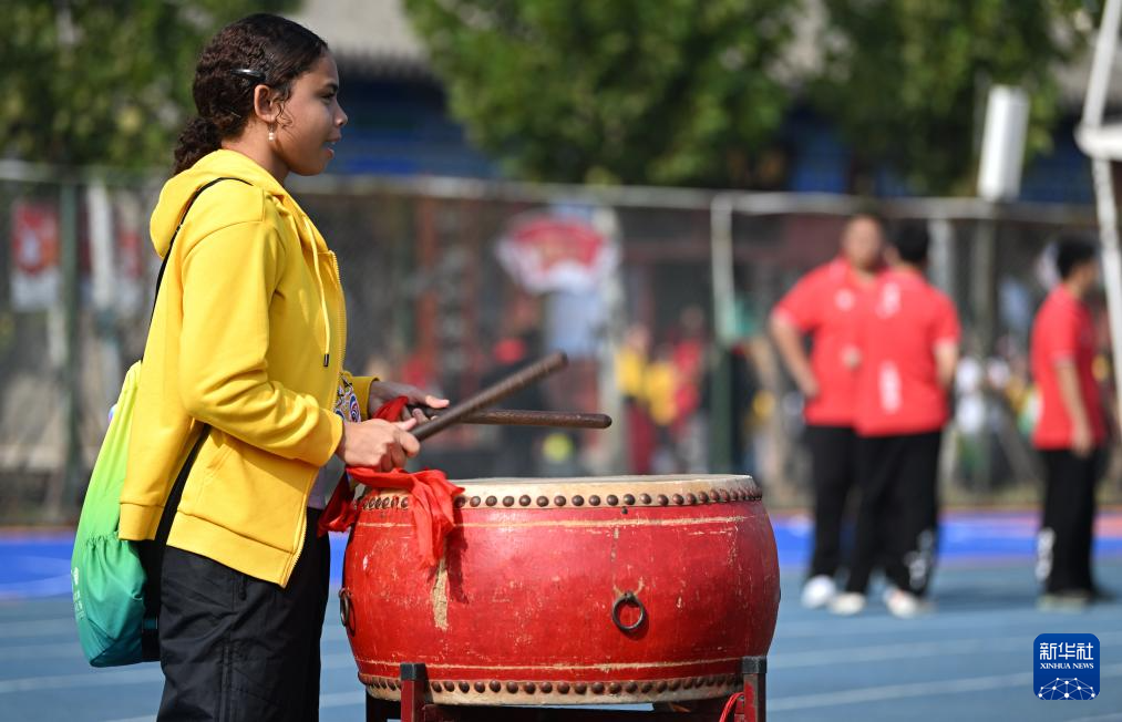 10月25日,“汉语桥”选手在天津霍元甲学校的操场上打鼓。