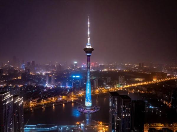 天塔,总高度415.2米——建成于1991年10月1日,成为当时亚洲第一的高塔,也是天津人民的骄傲。今日,一场主题为“追梦中文,不负韶华”的灯光秀在天津地标建筑天塔上演。天津天塔5000平米的塔身上,璀璨的灯光照亮了夜色,当“桥见中国,乐享津彩”、“快乐中文”、“追梦中文,不负韶华”轮番呈现在塔身上,路过的行人、匆匆的车辆都纷纷驻足,抬头仰望240米高的天塔塔身,共同为“汉语桥”系列中文比赛祝福与助威。(津云新闻编辑付勇钧)