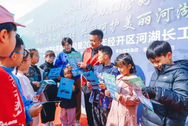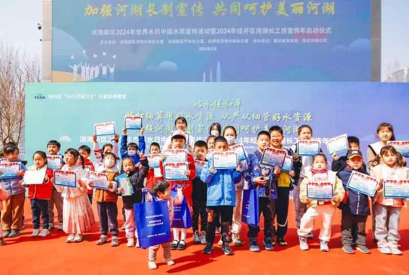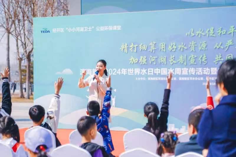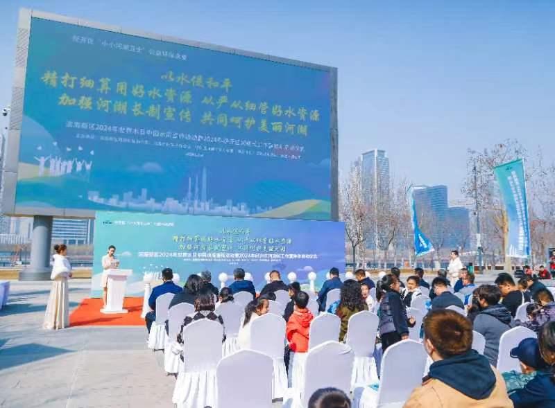 3月23日上午,经开区于家堡滨河公园广场上欢声笑语,“滨海新区2024年世界水日·中国水周宣传活动暨2024年经开区河湖长工作宣传年活动”正式启动。来自经开区内企业员工家庭的孩子们在海河边现场学习节水环保知识,争当“小小河湖卫士”,以此庆祝2024年“世界水日”“中国水周”。