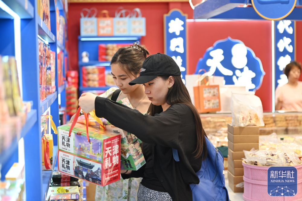 8月14日,上合国家学生在天津古文化街挑选文创品。