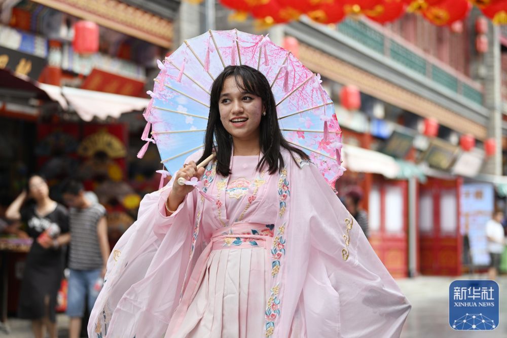 8月14日,上合国家学生在天津古文化街身着华服留影。