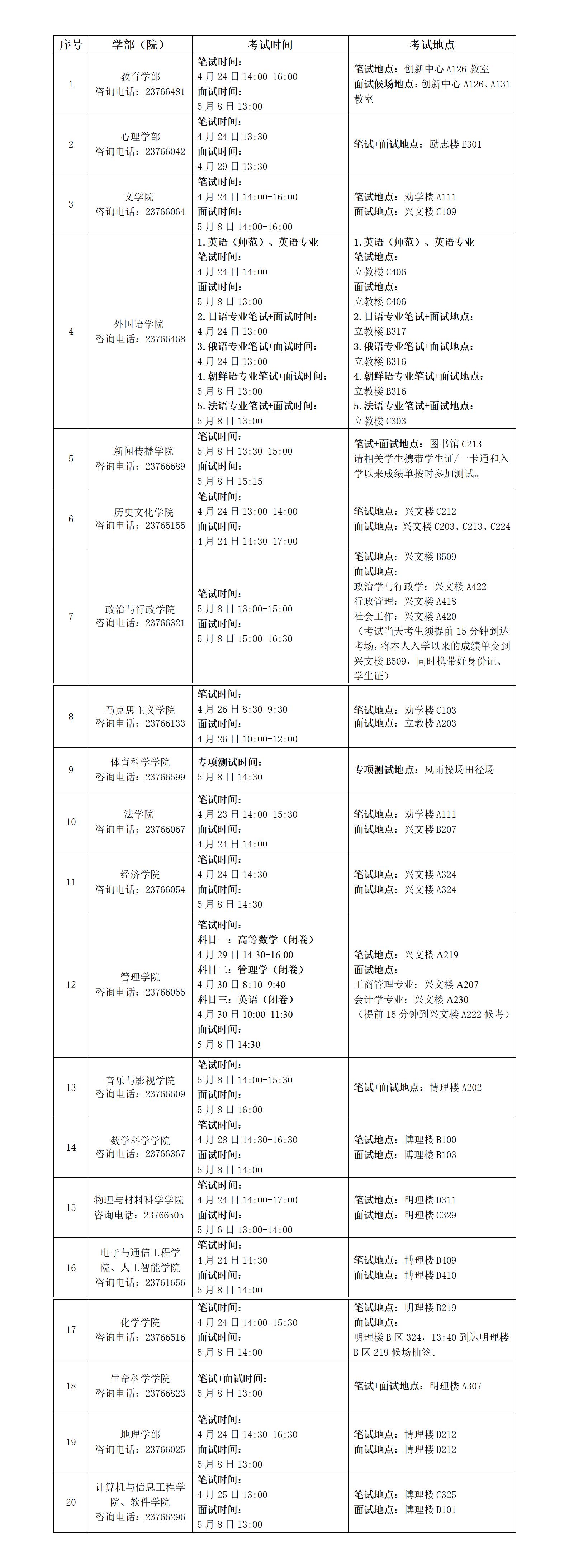 请申请转专业的学生提前做好准备,按时参加专业测试,缺考者视为自动放弃申请转专业。各接收转专业学部(院)的专业测试安排如下: