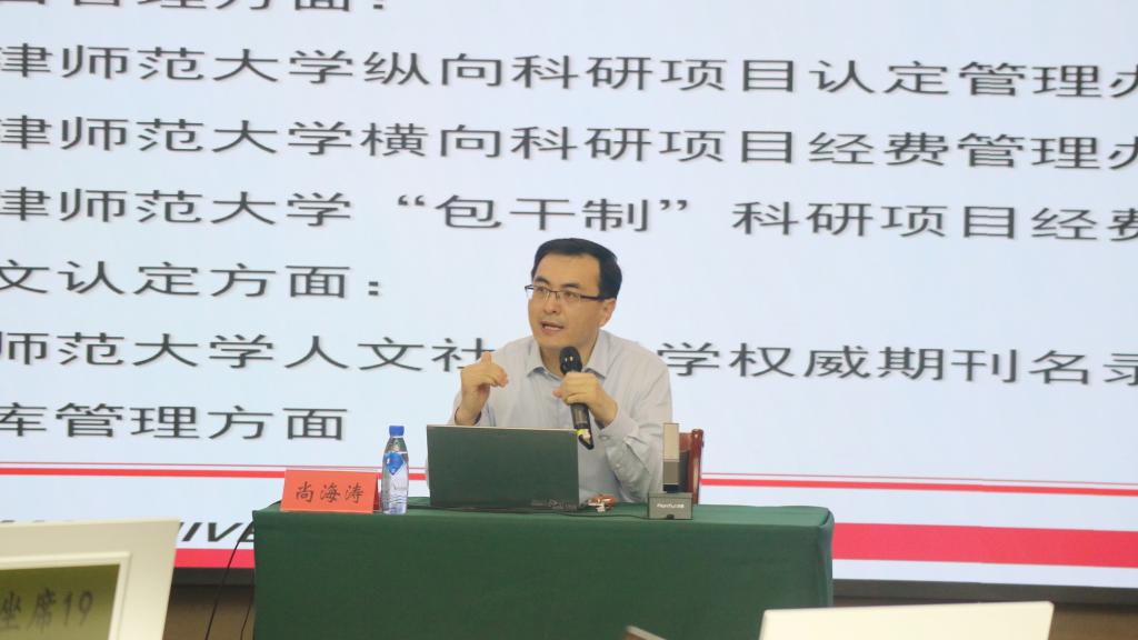 社会科学处处长尚海涛聚焦学校人文社会科学研究,从项目管理、论文认定、智库管理、科研机构管理、科研奖励、学术规范六个方面展开详细介绍,并通过解读学校哲学社会科学高水平科研项目培育与奖励实施办法、科研工作坊建设工作,鼓励青年教师开展高水平科学研究,产出标志性成果。