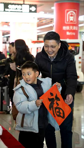 穿梭在送福活动现场,热闹的氛围如同一股暖流,包裹着每一个人。只见四处都排起了蜿蜒的长队,旅客们秩序井然地等待着。他们有的微微踮起脚尖,目光急切地望向书写台,眼神中满是对墨香祝福的期待;有的和身旁的人轻声交谈,话语里满是对即将到手的“福”字的憧憬。