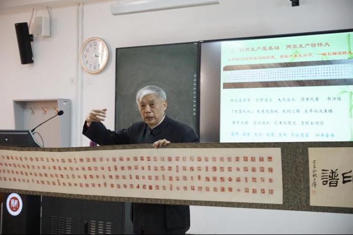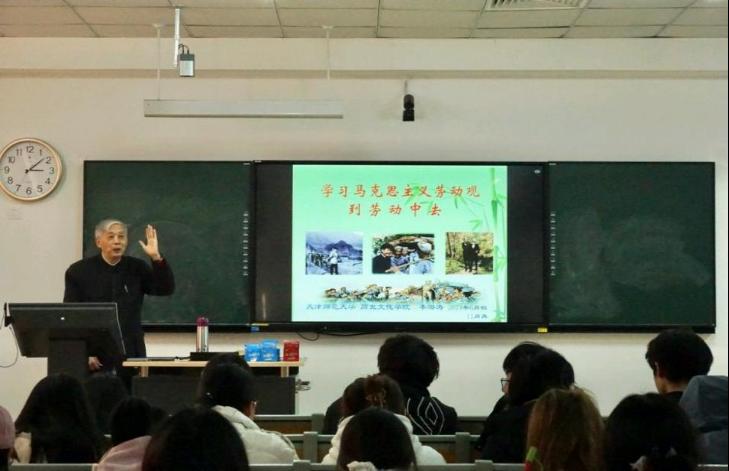 李海涛从马克思主义劳动观的起源和发展历程切入,深刻阐述了劳动在人类社会变革、生产力发展及思想文化塑造中的关键地位;通过讲述织布工、图书人等身边的平凡劳动者的故事,阐释了劳动创造世界,人民创造历史的深刻道理。授课过程中,李老师展示了劳动史诗般二百方印章卷轴,并现场教授演唱歌曲《军民大生产》,带领同学们感受“自己动手,丰衣足食”的劳动喜悦,勉励同学们热爱劳动,到劳动中去,深入实际、服务人民,迎着困难勇敢前行。