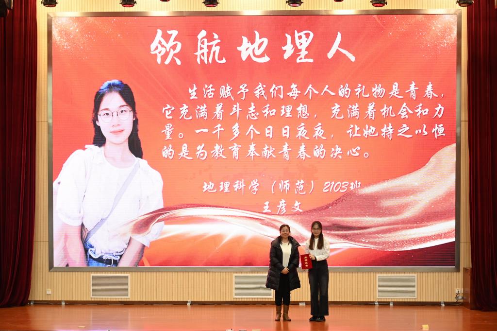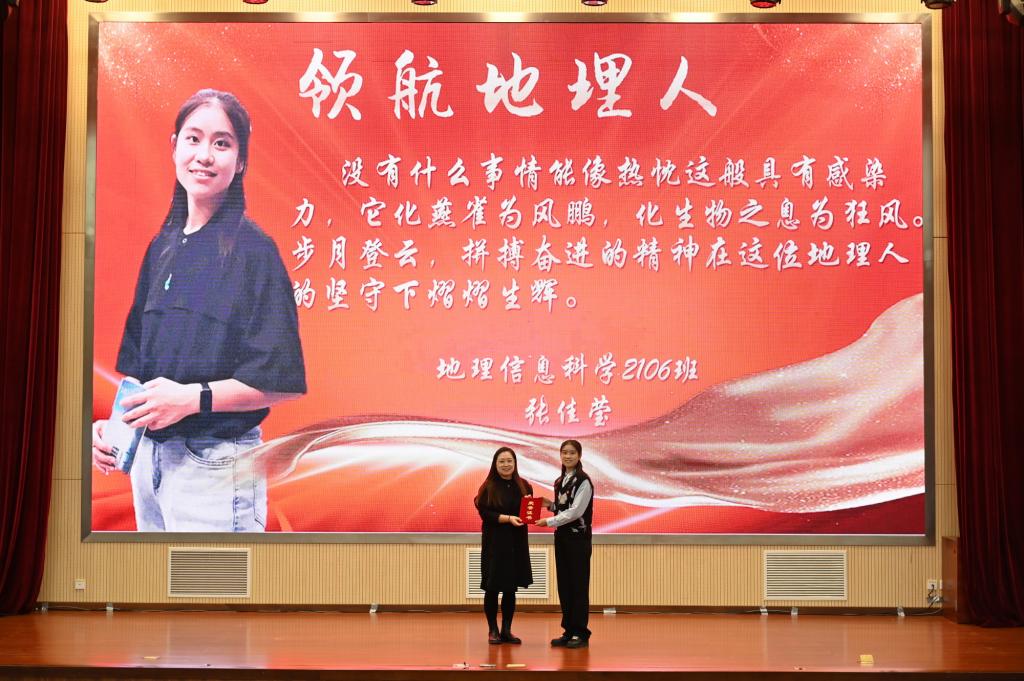 国家奖学金获得者谢子豪和张佳莹讲述了自己的成长故事,两位优秀学子分别被推免至华中师范大学和南方科技大学,将继续在他们深爱的地理教育行业和行星遥感领域披荆斩棘,发光发热。
