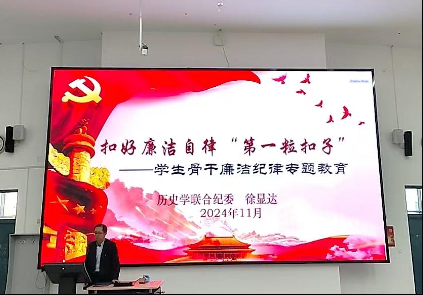 本站讯(通讯员 周二保)为深入贯彻落实习近平总书记关于加强新时代廉洁文化建设的部署要求,教育引导学生知廉、爱廉、兴廉,提升廉洁自律意识和纪律规矩意识,近日,历史学联合纪委面向学生骨干开展题为“扣好廉洁自律的‘第一粒扣子’”廉洁纪律专题教育讲座。历史文化学院、欧洲文明研究院辅导员、学生会全体学生骨干共计200余人参加活动。