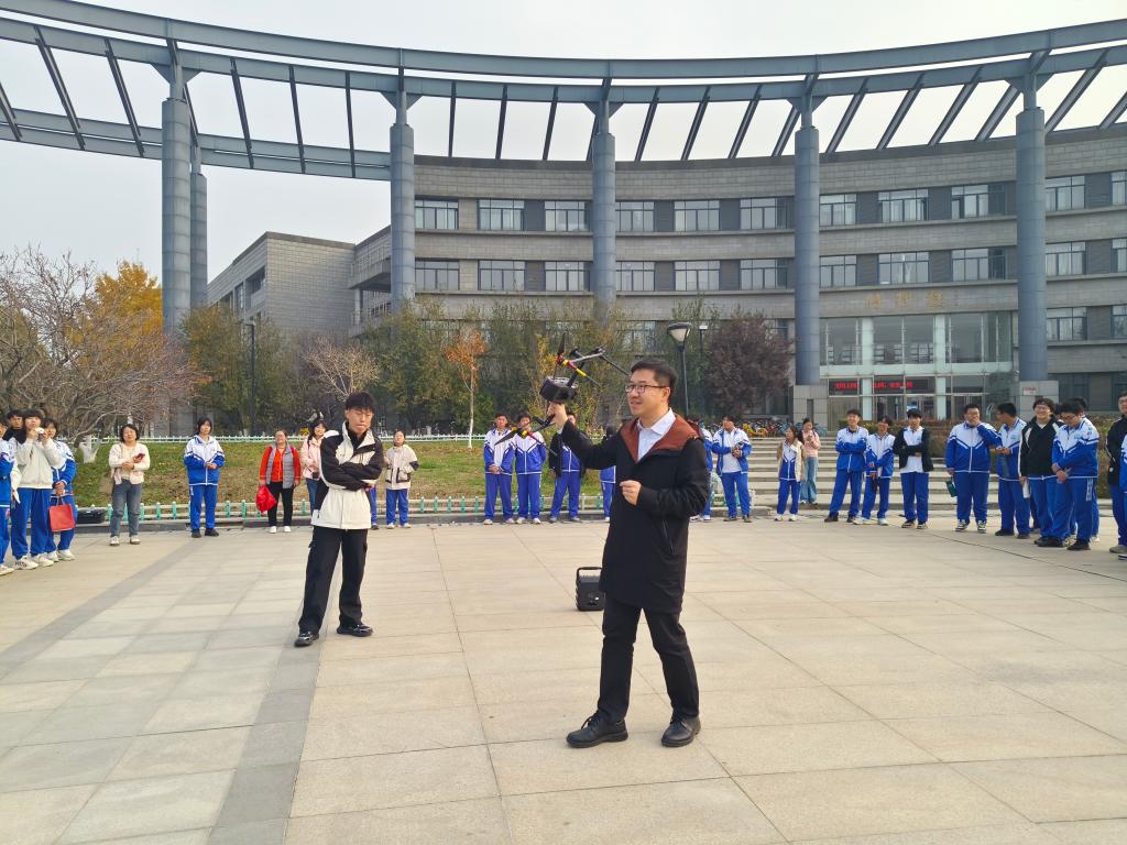 在时间广场,梁玉斌老师为同学们讲解了无人机的构造、工作原理、航行轨迹等知识,并在现场进行了模拟飞行。梁老师还结合自身科研成果详细介绍了无人机在各个领域的重要应用,让同学们了解这项前沿科技,帮助他们建立对科技发展的正确认知,树立科技报国的理想信念。
