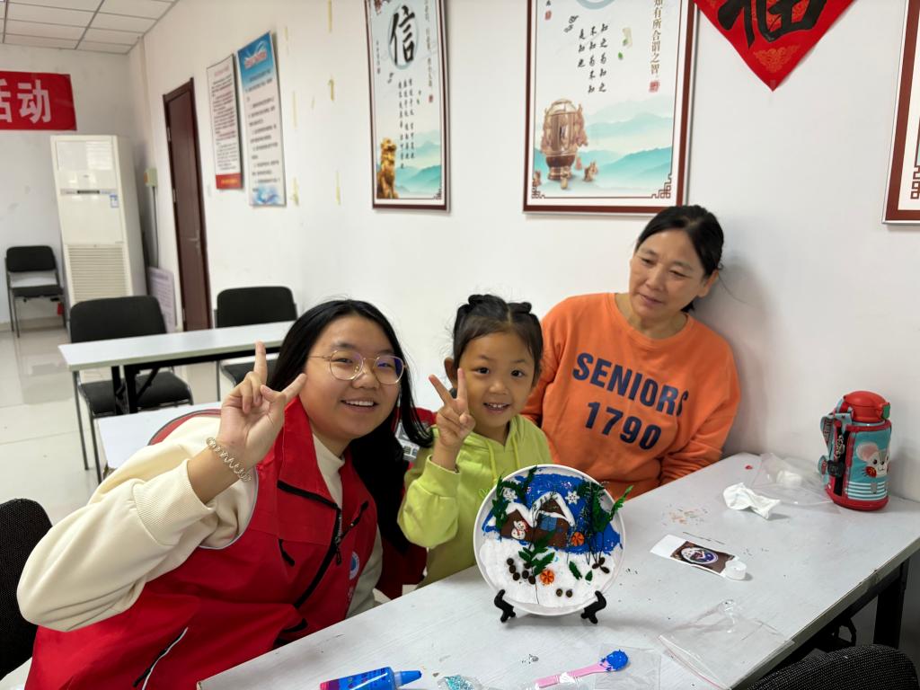 活动开始,来自经济学院青年志愿者协会的陈铭同学,通过有趣生动的ppt讲解,为盛兴佳园社区的孩子与家长们介绍传统节气立冬的气候特征与各地的饮食风俗,随后,志愿者与孩子们一同沉浸在色彩斑斓的手工世界中,共同为白盘子装点立冬的节气色彩,展现出自己的独特创意与美好愿望。小朋友们制作的彩盘充满对冬天的憧憬,童趣十足。