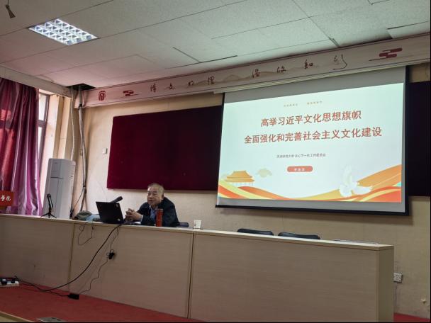 本站讯(通讯员 刘兆文)为进一步学习宣传贯彻习近平文化思想,11月7日下午,文学院党委邀请天津市教育系统关工委“习近平新时代中国特色社会主义思想和党的二十大精神研学基地”理论宣讲团成员,我校关心下一代工作委员会副主任、文学院教授李逸津为第70期入党积极分子作题为《高举习近平文化思想旗帜全面强化和完善社会主义文化建设》的专题讲座。文学院辅导员代表、青年教师代表、学生党员和第70期入党积极分子参加。讲座由院党委副书记、纪委书记魏晋雪主持。
