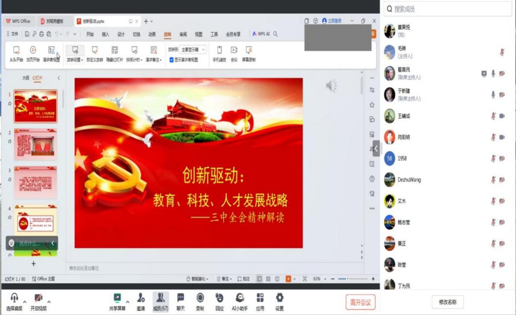本站讯(通讯员 董昊悦)为深入学习贯彻党的二十届三中全会精神,引导广大老干部切实把思想和行动统一到党中央的决策部署上来,近日,党委离退休工作部举行专题报告会,邀请我校关工委报告团成员、政治与行政学院翟昌民教授以“创新驱动:教育、科技、人才发展战略——党的二十届三中全会精神解读”为主题带领大家进行集体学习。我校离退休老干部、关工委成员、离退休教职工党支部书记、部分离退休党员和党委离退休工作部全体在职干部共70余人线上参加集体学习。会议由校关工委常务副主任于新建主持。