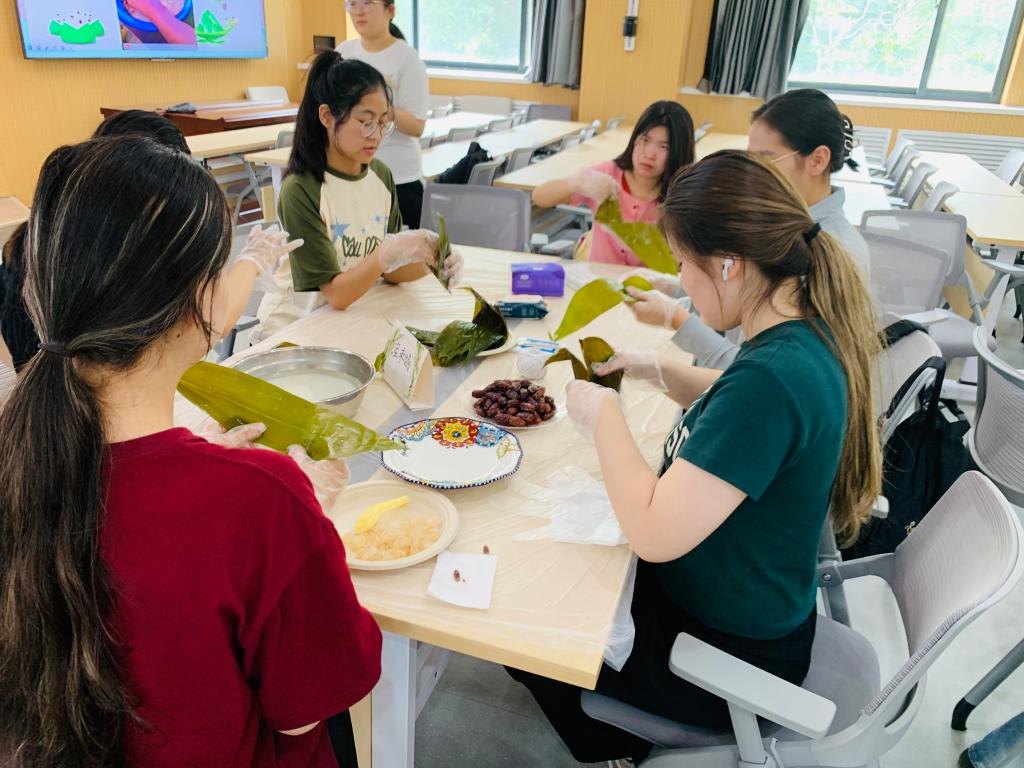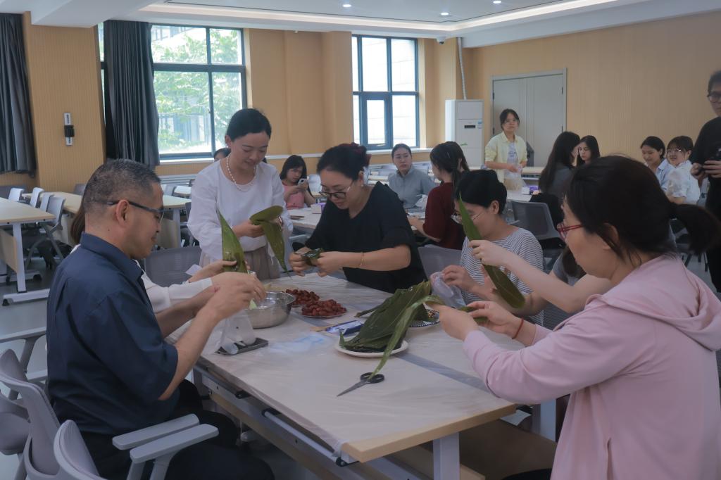活动现场,师生一边观看视频,一边学习包粽子的步骤,填米、放馅、裹叶、扎线……每个步骤都认真对待。在包粽子的过程中,师生们互相学习、默契配合,共同完成了一个个形态各异的粽子,现场欢声笑语,其乐融融。