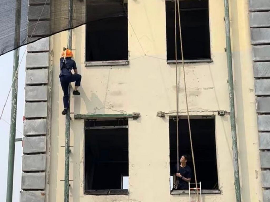 同学们来到消防员日常训练场地进行观摩体验。消防员为同学们展示攀登挂钩梯上四楼,整个过程从助跑到登上四楼仅用时30秒,东丽大道消防救援站的消防员训练有素,为同学们展示了娴熟的的救援技能以及强大的身体素质,现场爆发出热烈的掌声和欢呼。许多同学也在消防员的保护下体验攀爬过程,看似简单的动作实则需要强大的体能和心理素质来支撑。在此过程中,同学们对消防事业有更深刻的认识理解和崇敬。
