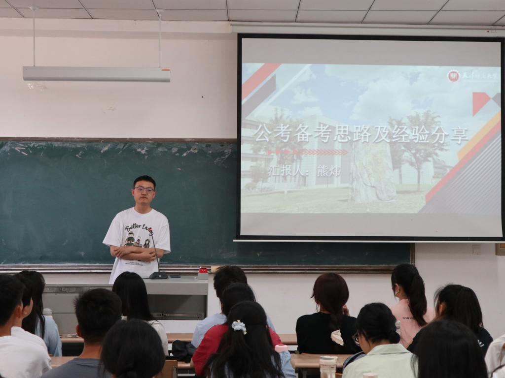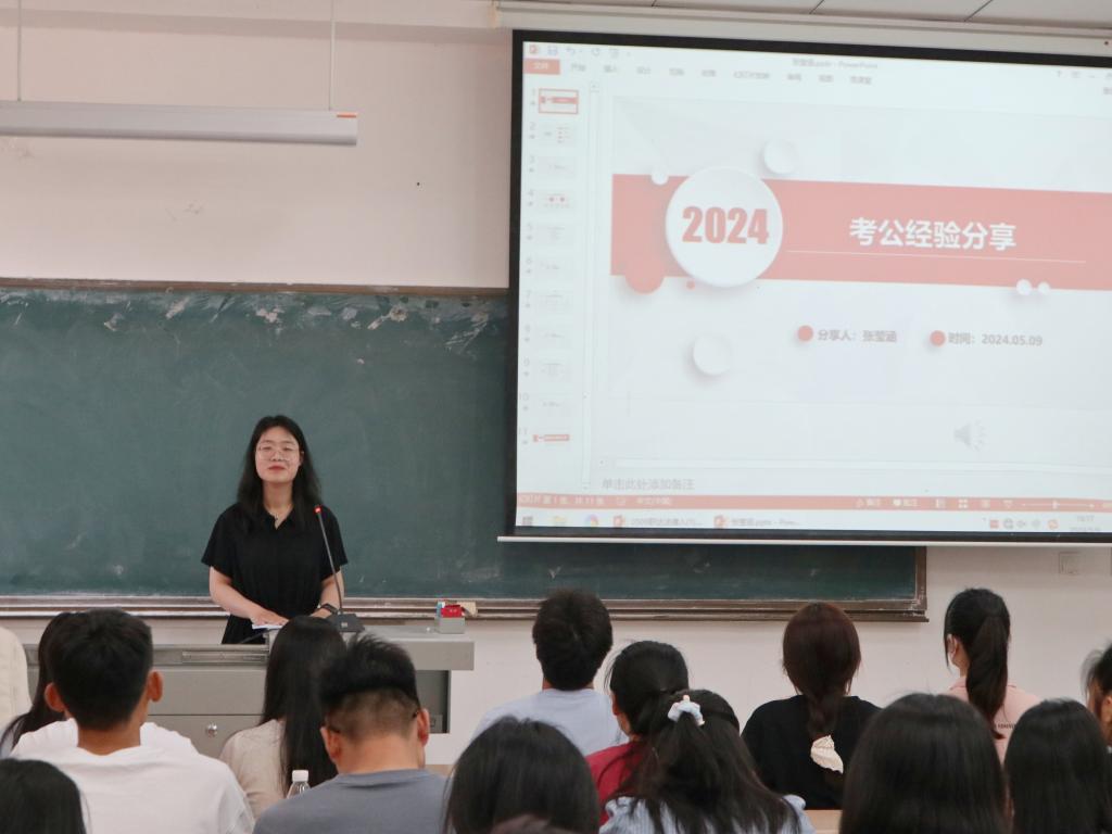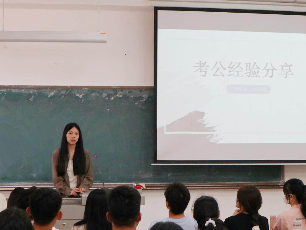 法学院消息(通讯员 王欣)为帮助同学们提前做好学业、职业规划,了解公务员考试流程,合理安排备考时间,5月9日下午,法学院在劝A108举办“职达法律人”考公经验交流分享会。2021级宪法学与行政法学专业硕士熊炜、2021级法律史专业硕士张莹涵、2021级法律(非法学)专业硕士高洁、2022级法律(法学)专业硕士吕雨欣从考试内容、选岗经验、时间安排、心态调整等方面作分享,60余名本研学生参加活动。