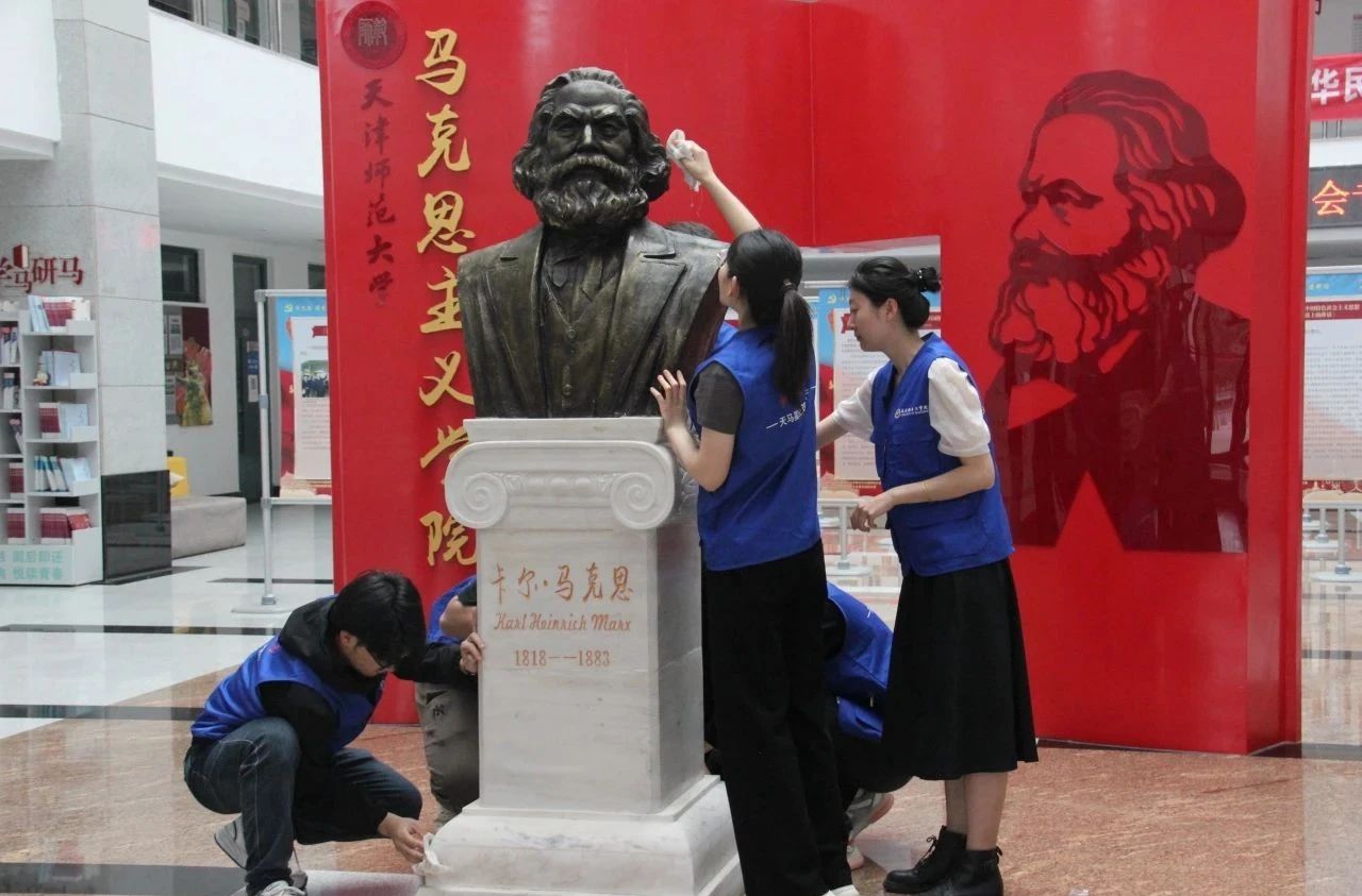 卡尔·马克思雕像庄严肃穆,同学们满怀敬意,掸扫擦拭雕像,表达了对马克思的敬仰和怀念之情。马克思主义中国化专业2023级硕士研究生王抗抗、马克思主义理论专业2020级本科生王远眸和思想政治教育(师范)专业2023级本科生张源清以诵读的方式带领同学们回顾了马克思的生平。