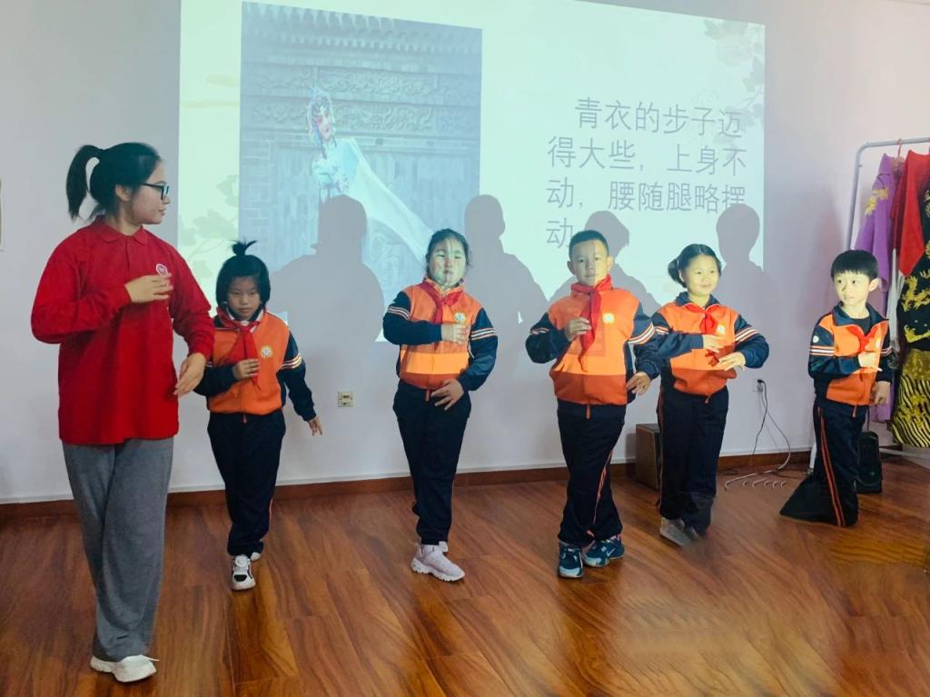 互动环节,小学生们身着戏服,现场学习戏曲旦角的手部基本功与台步,沉浸式感受京剧的韵味,稚嫩的指尖,流转出千百年京剧文化的丰富意蕴。