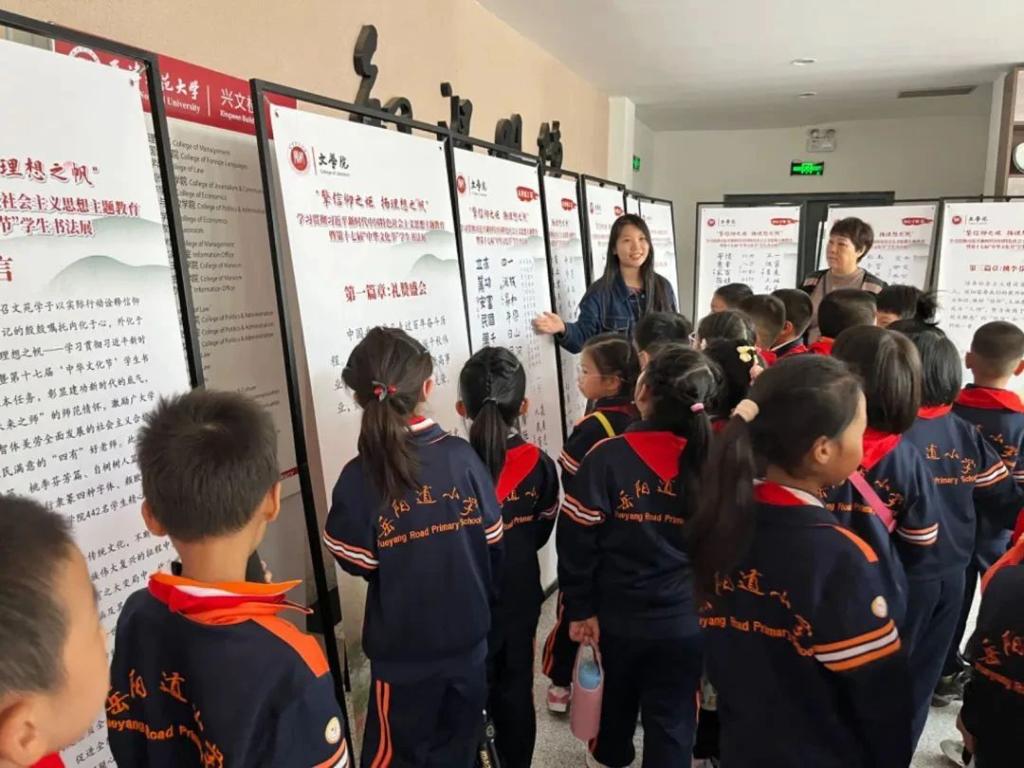 为让师生家长们多角度、深层次地感悟中华文化之美,文学院中华优秀传统文化宣讲团志愿者还带领他们参观了“中华文化节”学生书法展,从秦篆汉隶到魏碑唐楷,笔墨间中华五千年文明浸润着小朋友们的心灵,小朋友们面对着书法作品吟诵出《七律·长征》,少年人释放出的爱党爱国情怀激昂人心。