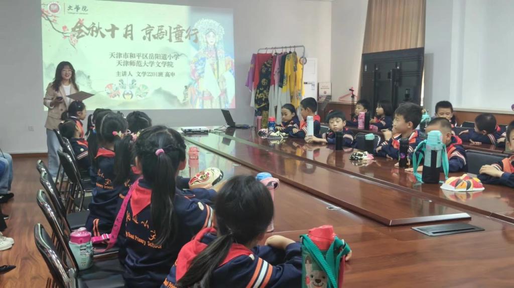 文学院消息(通讯员 李磊)为深入学习贯彻习近平文化思想,传承弘扬中华优秀传统文化,10月8日,文学院开展“金秋十月 京剧童行”沉浸式京剧普及与体验大中小“思政一体化”主题活动,全景展示国粹魅力,开启京剧艺术探索之旅。天津市和平区岳阳道小学副校长苏蕊,文学院党委书记李静,党委副书记、院长赵利民,党委副书记、纪委书记张杨出席活动,天津市和平区岳阳道小学师生家长代表参加活动。