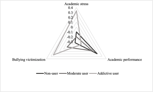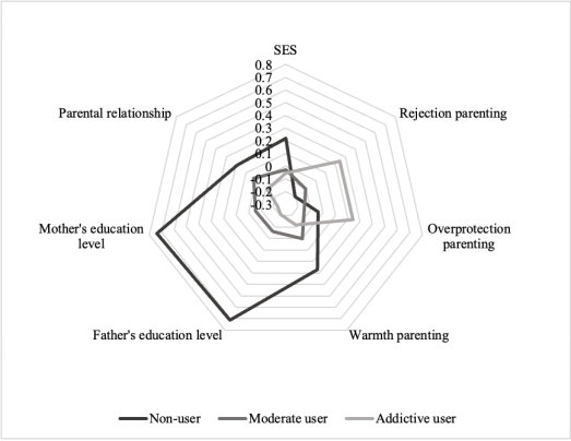 研究结果发现,在1346名青少年中,共有199名报告从不使用短视频软件。根据短视频成瘾量表的得分,在1147名使用者中,686名青少年被归为适度使用者,461名为成瘾使用者。研究人员比较了非使用者,适度使用者和成瘾使用者在心理社会因素上的差别。结果显示,相比非使用者和适度使用者,成瘾使用者表现出了更负面的心理健康状况,包括更高的抑郁、焦虑、压力、孤独感、社交焦虑、注意力问题,以及更低的生活满意度和睡眠质量。成瘾使用者也面临着更高的学业压力,更差的学业表现,更多的欺凌受害,更糟糕的父母关系,更负面的养育方式,以及较低的父母教育水平。适度使用者和非使用者的家庭环境存在差异,但在心理健康或学校表现上并无显著差异。