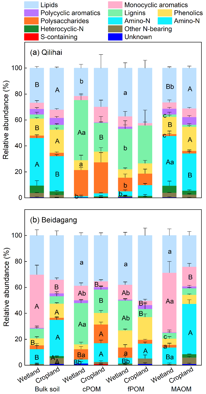 滨海湿地具有重要的生态系统服务功能,包括巨大的碳库和很高的碳汇能力。然而,湿地不同粒级有机质(SOM)的化学组成及其对长期开垦的响应机制尚不清楚。本研究以渤海湾滨海湿地(七里海和北大港)为研究区,基于粒级分组得到粗颗粒(cPOM,>250μm)、细颗粒(fPOM,53-250μm)和矿质结合有机质(MAOM,<53μm),采用热裂解-气相色谱/质谱技术分析了不同淹水条件湿地开垦为后有机质化学组成及其空间分异规律。我们发现,北大港湿地中微生物衍生的含N化合物显著高于七里海湿地,这与不同的淹水条件有关。七里海湿地开垦降低了MAOM中含N化合物(−28%)的相对丰度,却提高了脂类(+17%)和酚类(+40.7%)的相对丰度。北大港湿地开垦降低了三个粒级组分中单环芳烃的相对丰度(−60.3% ~ −70.2%),提高了含N化合物的相对丰度(+175% ~ +407%)。相比之下,湿地开垦后SOM的化学组成呈现趋同性。综上,SOM化学组成的分异及变化趋势既受到粒径的调控,同时也受控于湿地初始的淹水条件。