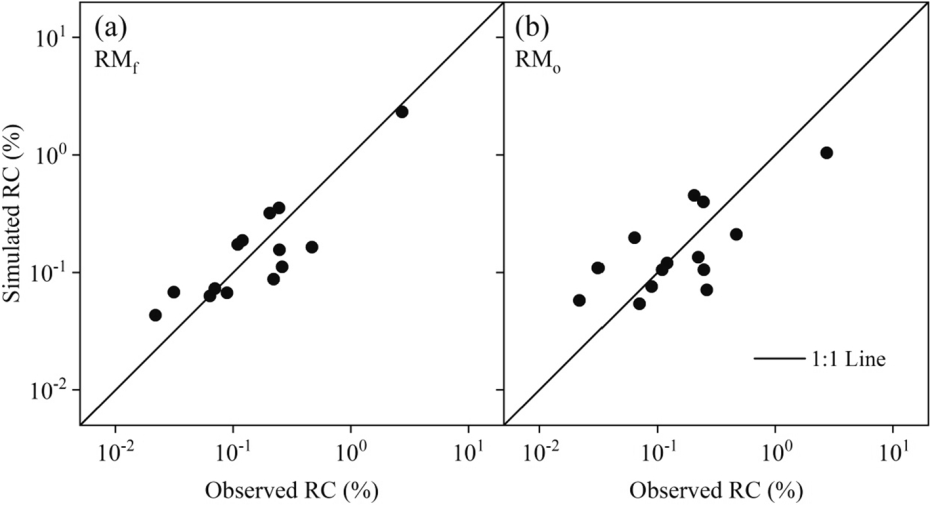 图2 径流系数(RC)观测值和拟合值的比较,RMf表示考虑降雨波动回归模型,